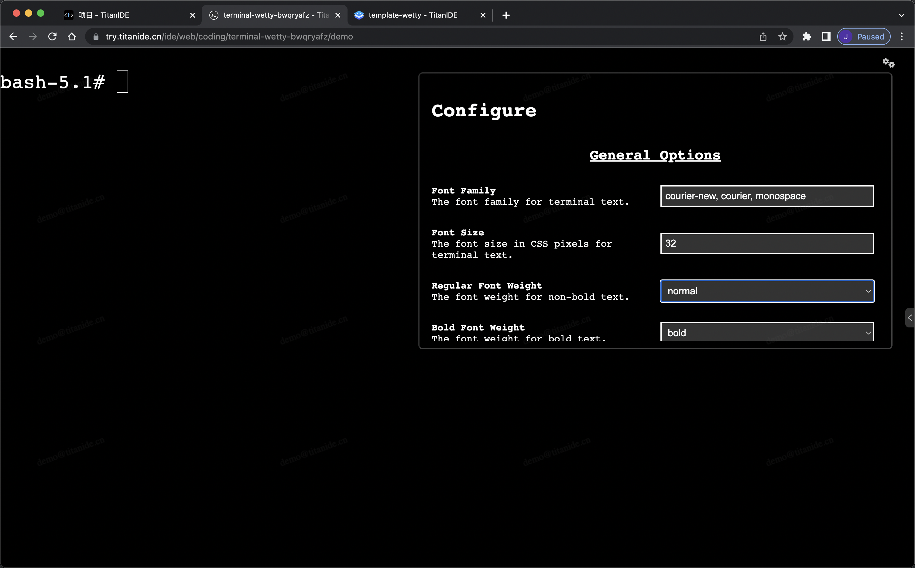 总体来说 WeTTY 是一个不错的 Web 终端,简单的几步就构建了一个 TitanIDE 模板镜像,并用它新建项目,直接打开使用。从使用的角度来看,功能和性能都很不错,也可以在页面直接定制字体,主题颜色,操作系统适配等等。如果作为一般用途,比如代替 xshell 等工具做运维相关工作还是很有竞争力的。但是希望用 WeTTY 来作为日常开发用,我相信也是可以的,不过这就需要花更多的时间去折腾了。